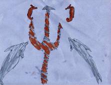 Dan’s colony was supposed to be located “somewhere in the Atlantic ocean,” deep underwater and on the bottom of the ocean to protect it from storms and other disasters occurring on the surface. Dan drew a sketch of the flag that has a golden trident on a blue background. The trident is directed upward, symbolizing our future progress. Two seahorses and two dolphins next to the trident emphasize our proximity to nature. The dolphins also swim upward, adding their encouraging message to that of the trident.