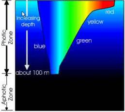 Caoilin suggested building our colony where there are less tropical storms and the water is warmer and richer with plankton. She did not want to go deeper than 700 feet and later changed this to 200 feet after learning that at 700 feet it is too dark for flourishing vegetation and therefore there is little plankton. Below is an illustration of how water absorbs light (http://www.marinebiology.org/oceanography.htm).